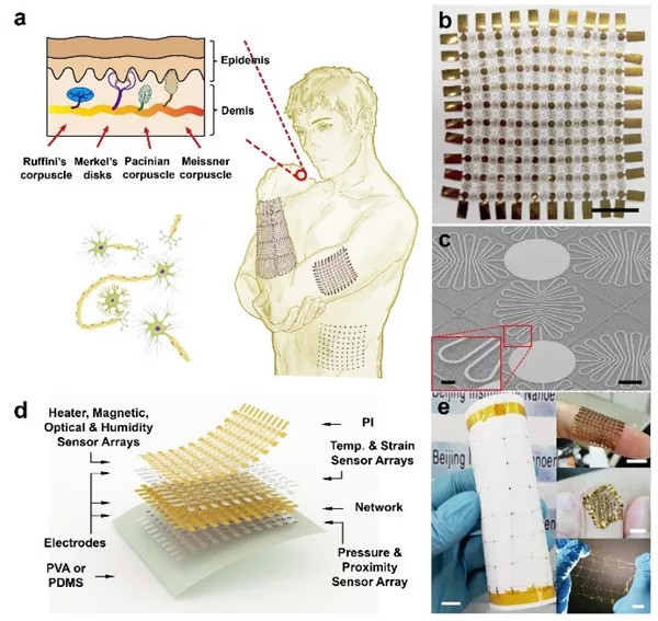 中国科学院北京纳米能源与系统研究所王中林院士研究团队提出了一种柔性可拉伸扩展的多功能集成传感器阵列,成功地将电子皮肤的探测能力扩展到7种,实现了温度、湿度、紫外光、磁、应变、压力和接近等多种外界刺激的实时同步监测。同时,这种电子皮肤可用于制造了一种具有定制化功能集成的智能假肢,既能赋予假肢触觉功能,同时也使其具备温度感知能力,这将有利于改善残疾患者的康复及生活条件。多功能集成电子皮肤还将有助于开发新型人机接口、智能机器人、仿生假肢、人体健康监测等智能化系统。