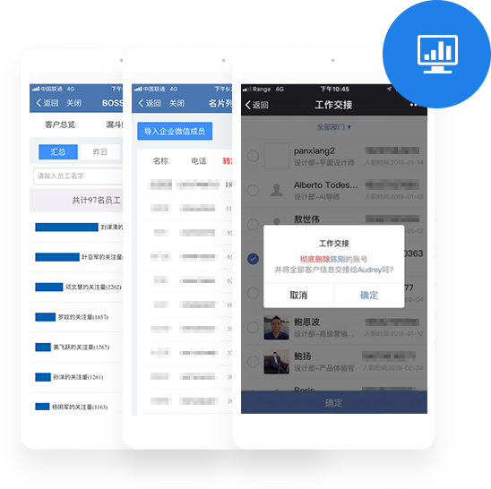 管理端可以直接看到所有销售的数据统计还可以看到销售与客户接触时的聊天内容,也能够看到销售每一天接触客户的情况,速赞人工智能名片将每一个销售的工作情况都及时汇总到了管理层方面,无需销售录入,缩短反馈时间。