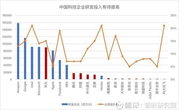 中国企业目前的研发投入并不尽如人意。纵观中美主要科技企业,研发支出TOP10中,仅有华为、腾讯、阿里三家中国企业,且其研发投入占营收的比例普遍偏低。