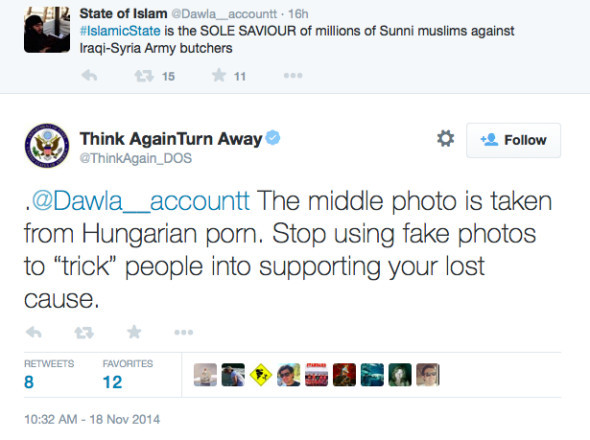 早在2014年美国国务院一个下属网络辟谣账户,在twitter网上就指出伊斯兰国的账号,使用匈牙利生产的色情照片,来伪造当地妇女被性侵犯的场景。然而结果却适得其反。 Twitter用户没有为在线反对极端主义的斗争而欢呼,而是提出了更多的问题,比如就有网民回应称:“国家部门怎么知道这是匈牙利色情片?老兄......你对匈牙利色情片的了解非常丰富啊!”。经过大量的批评后,国务院不得不删除了这个账户。