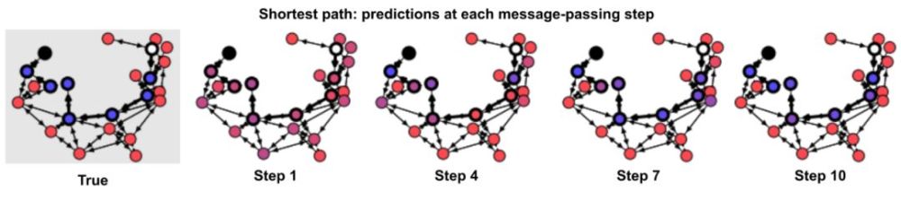 「shortest path demo」创建随机图,并训练一个图网络以在任何两个节点的最短路径上标记节点和边。经过一个信息传递步骤序列(如下图所示),模型可以改善其对最短路径的预测。