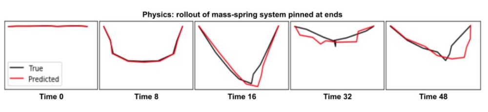 「physics demo」创建了一个随机弹簧物理系统,并训练一个图网络来预测系统在下一个时间步的状态。模型的下一步预测可以被反馈作为输入,以构建未来轨迹。以下每个子图展示了 50 步内的真实和预测的弹簧系统状态。这和 Battaglia 等人(2016)的「interaction networks」中的模型和实验相似。