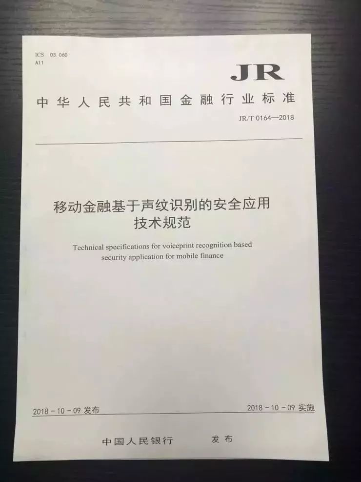 《关于发布金融行业标准规范声纹识别技术金融应用的通知(文件编号:0001-2018-S-000-005057)》已随该标准的印刷版一同下发给全国各大银行及各类金融机构,标准的电子版也将择日公布。