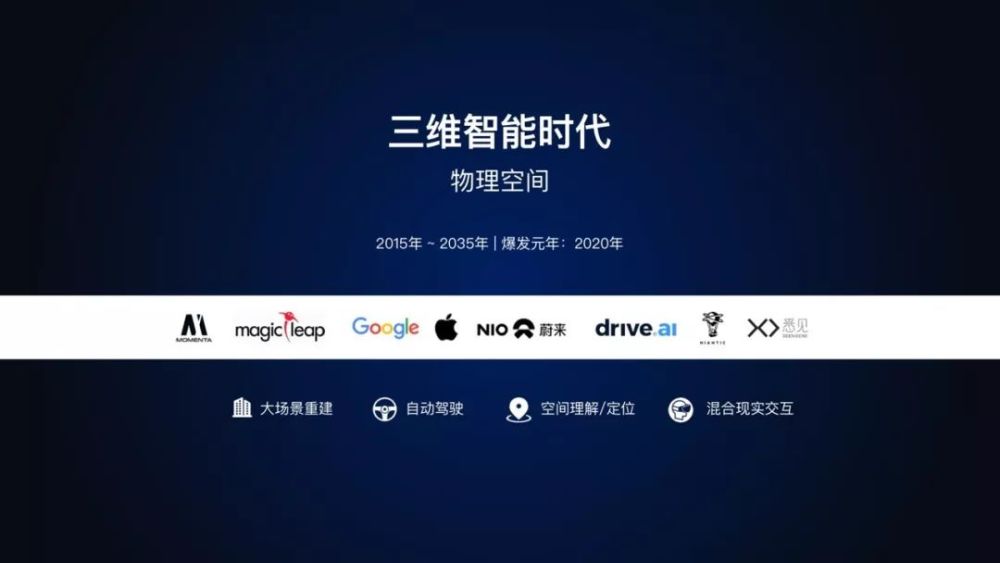随着算法和算力的快速发展与数据的指数级累积,2005年左右开始出现以文本和语音为数据的一维智能公司,如Google、百度、科大讯飞等,以及以图片和视频为数据的二维智能公司,如旷视、商汤、云从等。