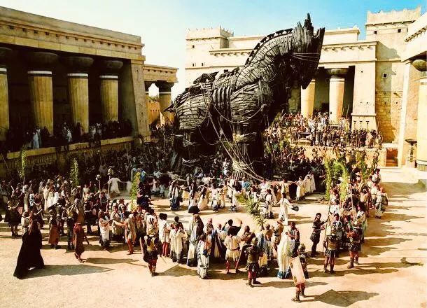 雅典卫城破损的神庙恢复如初,在雅典娜女神帮助下的希腊人,好像正在设计特洛伊木马;