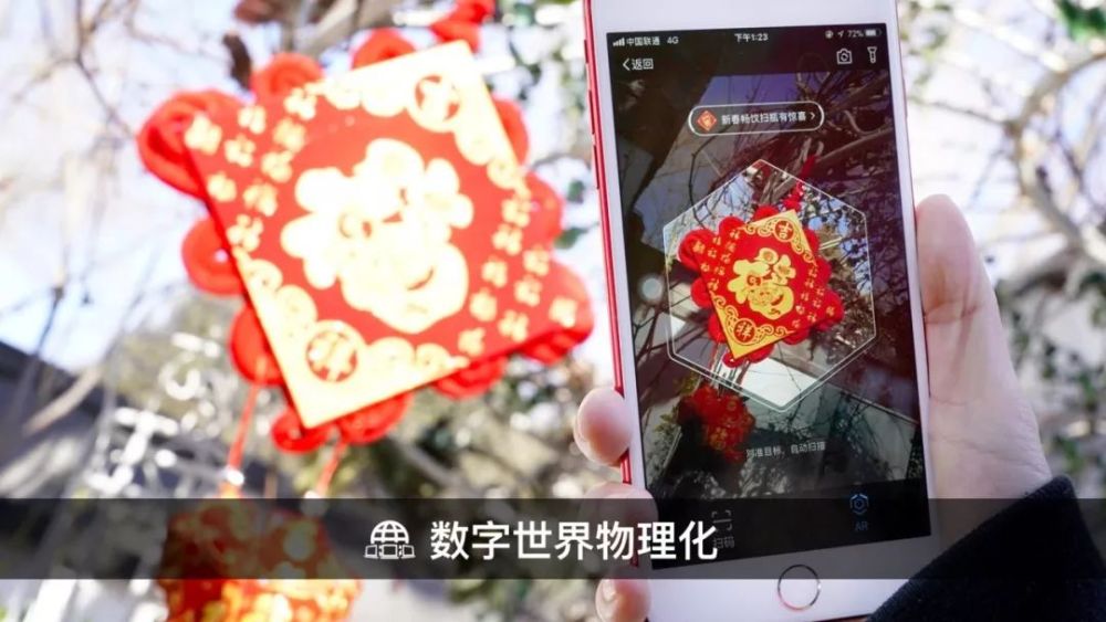 在现实世界,这部分做得还很差。我们现在和数字世界交互、建立物理和数字链接的方式还很简单,用PC和手机。扫福字、扫红包就是很典型的体验,通过图片和平面的扫描,把数字世界的相关信息激活,用手机屏幕显示出来。