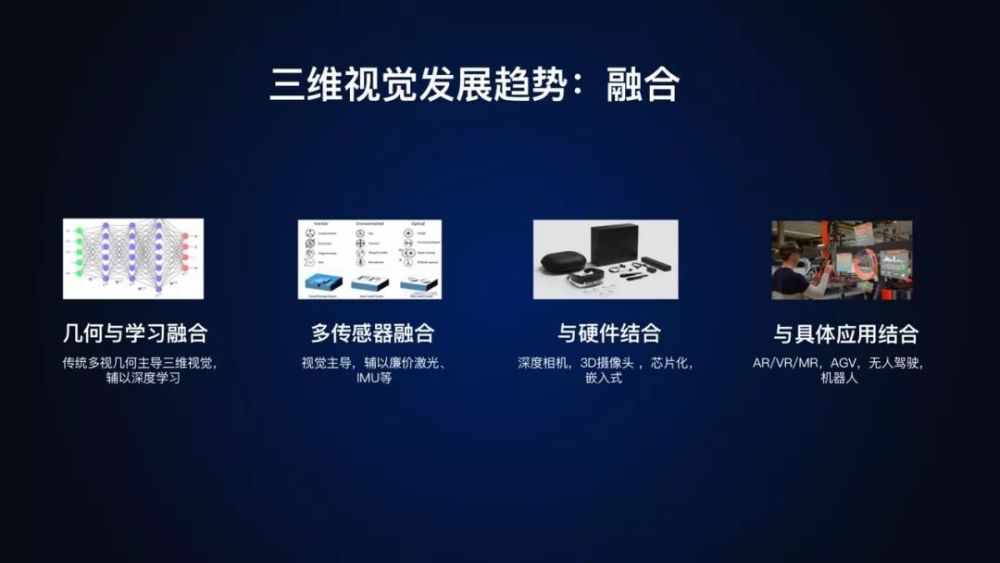 传统几何算法与深度学习方法的融合、多传感器的融合、软件云服务与硬件的融合(包括算法的硬件化/芯片化)、以及与具体应用的结合,比如AR/VR/MR、AGV、自动驾驶、机器人等等。