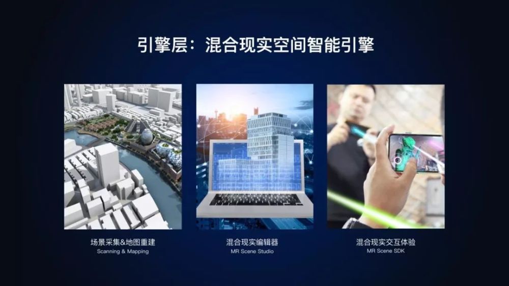 在引擎层,我们提供了整套的自动化建图工具、混合现实场景编辑工具,以及适配多种设备的终端SDK。