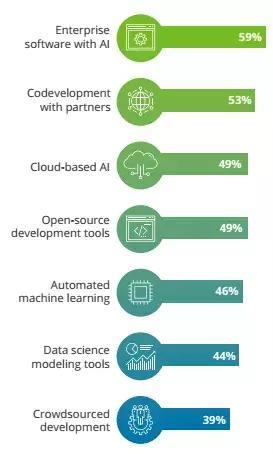 基于云的深度学习服务可以让企业获得巨大的、曾经成本昂贵的计算力——计算力是从非结构化数据中提取见解所必需的。他们还可以管理大数据集,使用预训练好的模型加速 APP 开发。虽然公司有无数的方法来获取现成的人工智能技术或开发自己的人工智能,但许多公司也在寻求外部支持(专门技术/专家意见)。53% 的调查对象与合作伙伴共同开发认知技术,近 40% 的受访者在使用 GitHub 等众包社区。