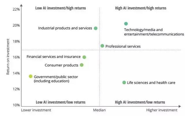 注:图中的虚线表示,所有调查对象(跨行业)的投资回报率中值和人工智能投资中值。资料来源:德勤,企业中的人工智能调查报告,第 2 版,2018 年