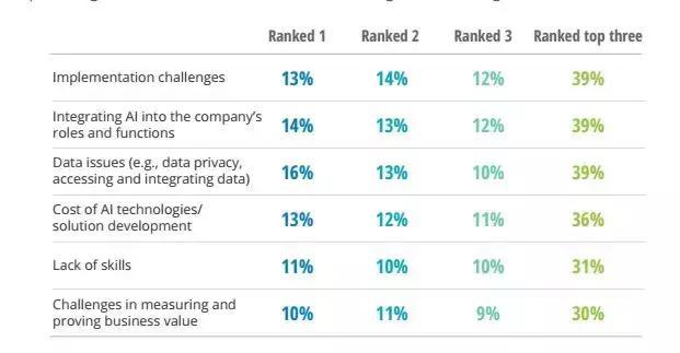 商业和技术领导者在寻求用人工智能创造商业价值的过程中面临着一系列挑战。许多调查对象指出,实施、整合到角色(业务)和功能中去,以及衡量和证明人工智能解决方案的商业价值是人工智能项目最大的挑战。(见图 5)