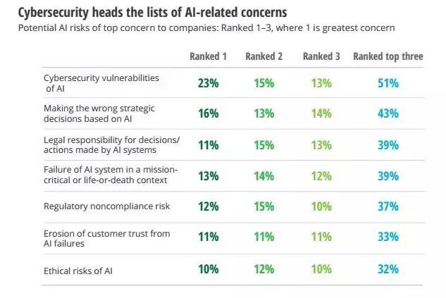 主管们关注的人工智能风险主要是网络风险,对半数调查对象来说,网络风险排名前三(见图 6)。事实上,23% 的受访者将「网络安全漏洞」列为他们最关心的人工智能/认知问题。这种担忧可能是有道理的: 虽然任何新技术都存在某些漏洞,但某些人工智能技术面临的、与网络相关的责任似乎特别令人烦忧。