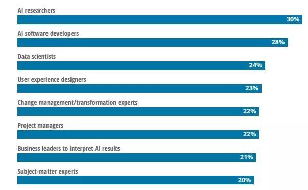 例如,数据科学家经常会因不清楚他们应该解决的业务问题而陷入困境。其结果可能是该人工智能项目会失败,而因此感到失望的数据科学家可能会转而投奔竞争对手。实际上,能够为数据科学家解读数据又能为主管解读业务的的领域专家是十分珍贵的。然而,在我们的调查中,只有 20% 的公司表示需要他们。在他们难以实现人工智能解决方案和项目管理工作的情况下,令人惊讶的是,只有 22% 的受访者表示需要这些技能。