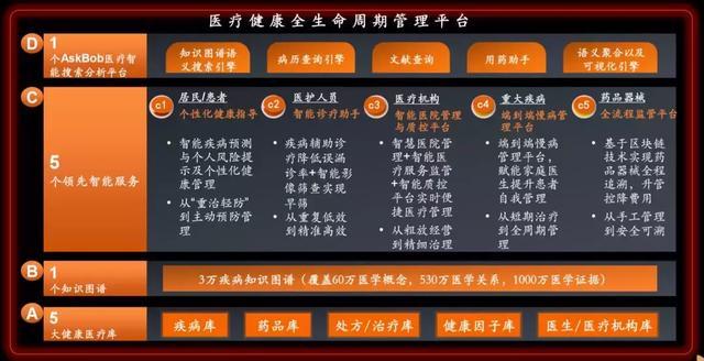 平安医疗推出的医疗健康全生命周期管理平台,就在五个大健康数据库和一个包含三万项疾病的知识图谱上,推出了五项领先智能服务。