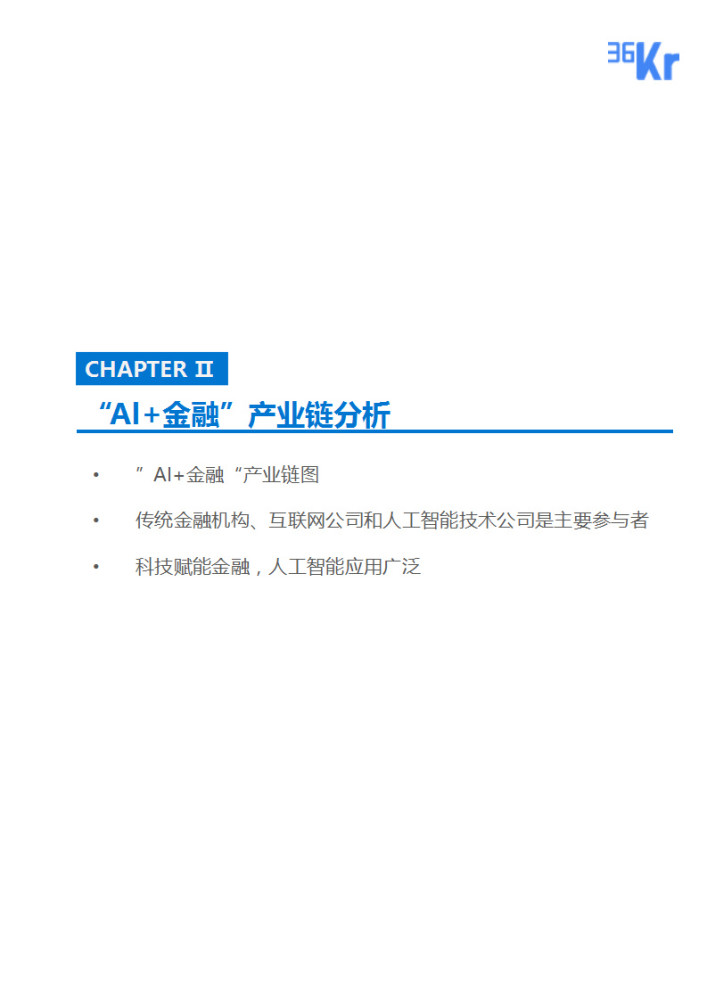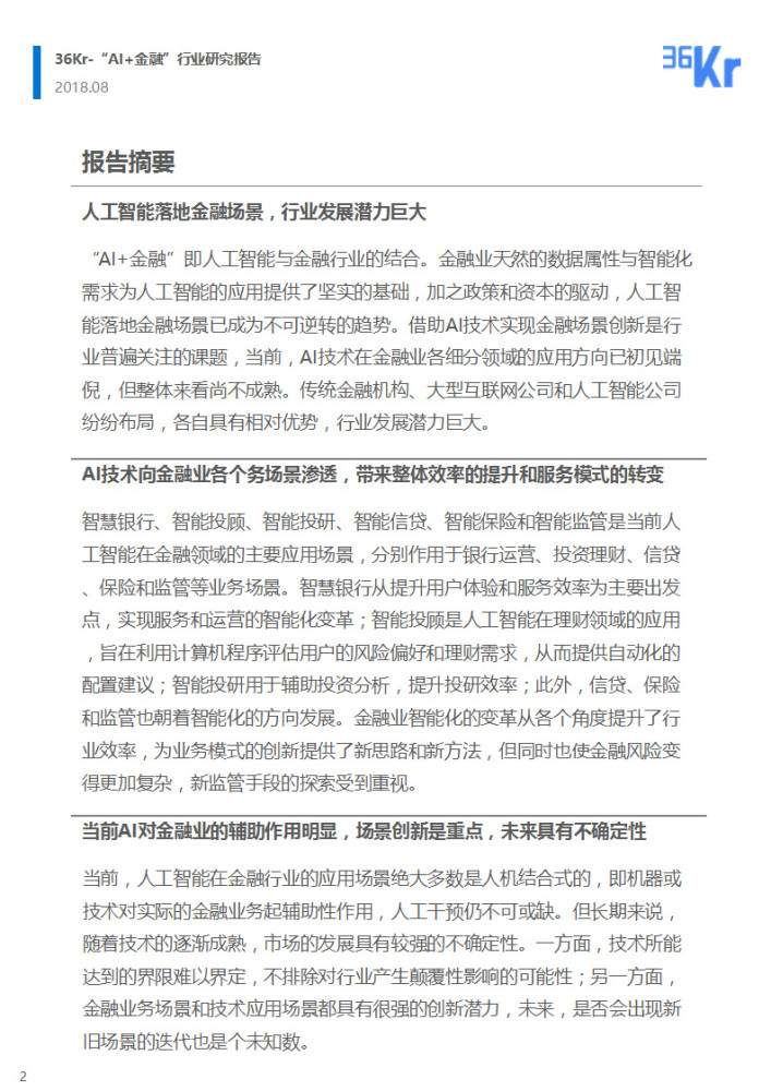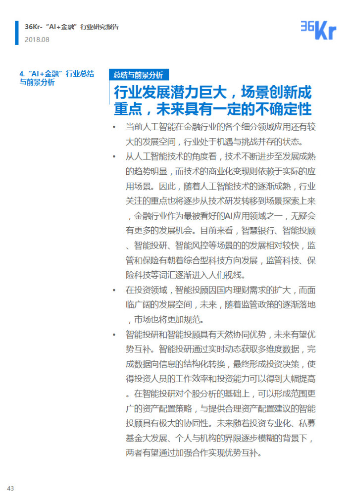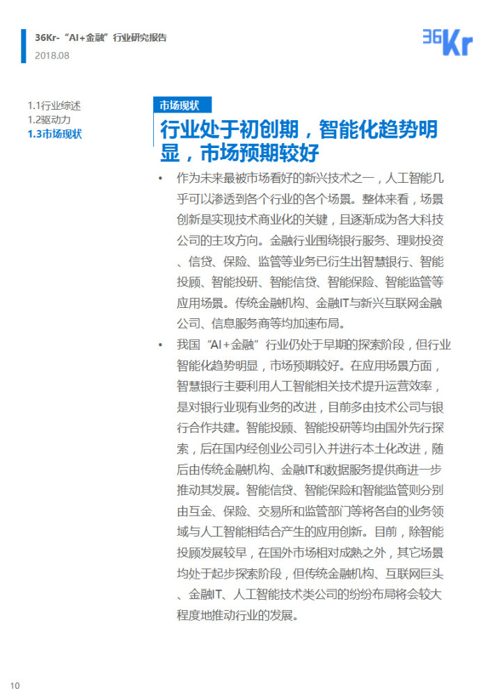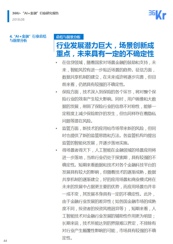 当前人工智能在金融行业的各个细分领域应用还有较大的发展空间,行业处于初创期,机遇与挑战并存。