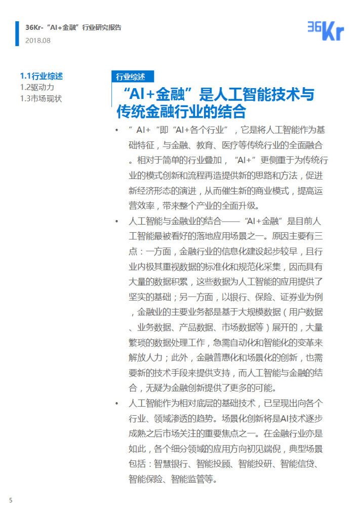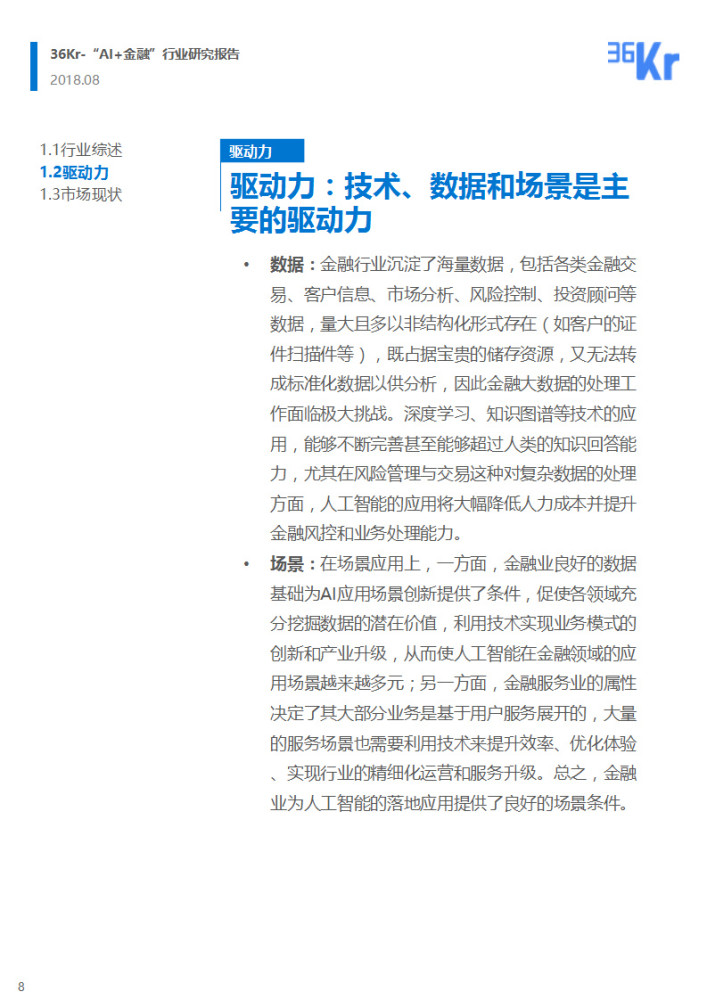 原因主要有三点:一方面,金融行业的信息化建设起步较早,且行业内极其重视数据的标准化和规范化采集,因而具有大量的数据积累,这些数据为人工智能的应用提供了坚实的基础;另一方面,以银行、保险、证券业为例,金融业的主要业务都是基于大规模数据展开的,大量繁琐的数据处理工作,急需自动化和智能化的变革来解放人力;此外,金融普惠化和场景化的创新,也需要新的技术手段来提供支持,而人工智能与金融的结合,无疑为金融创新提供了更多的可能。
