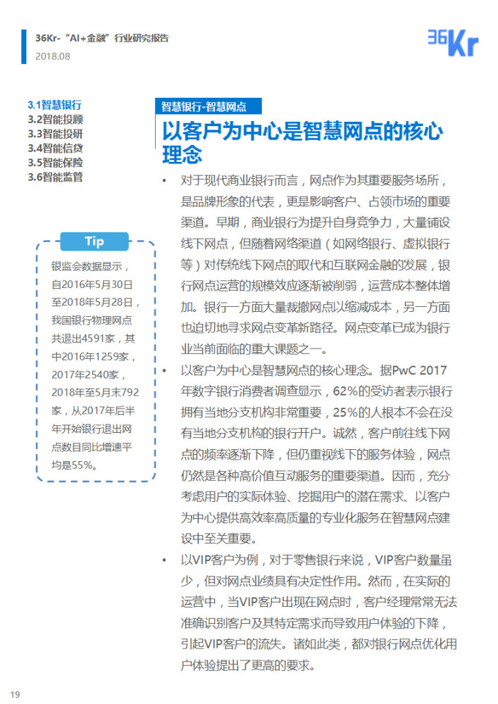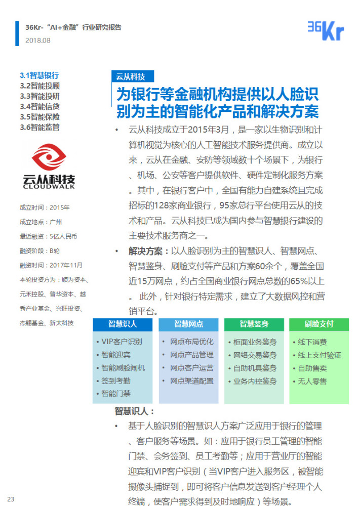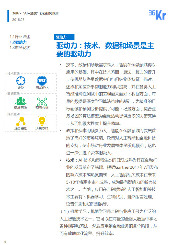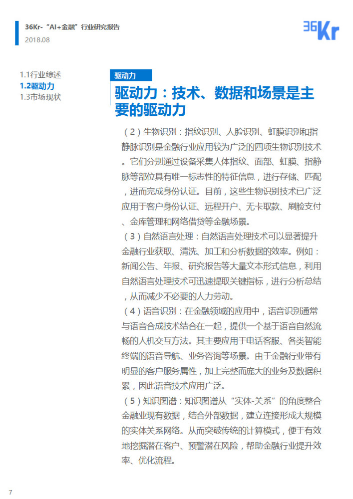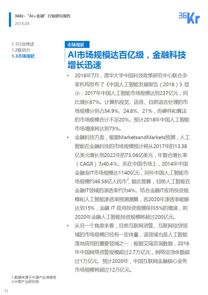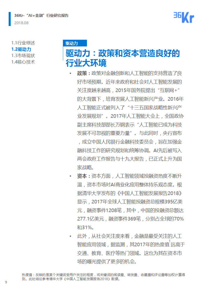 从人工智能技术的角度看,技术不断进步至发展成熟的趋势明显,而技术的商业化变现则依赖于实际的应用场景。因此,随着人工智能技术的逐渐成熟,行业关注的重点也将逐步从技术研发转移到场景探索上来,金融行业作为最被看好的AI应用领域之一,无疑会有更多的发展机会。