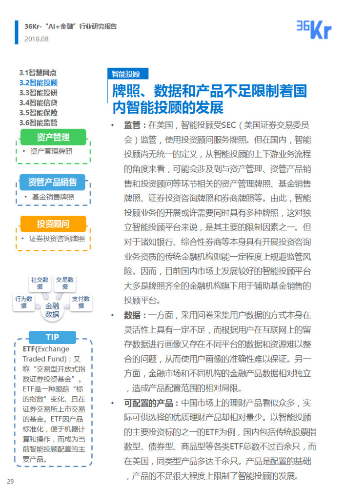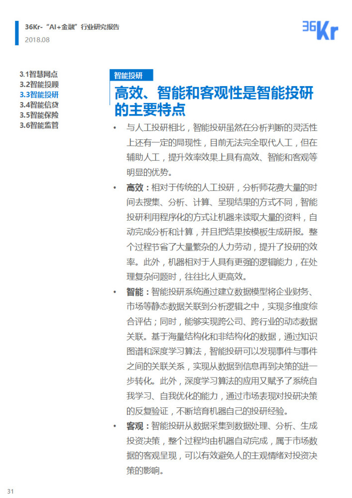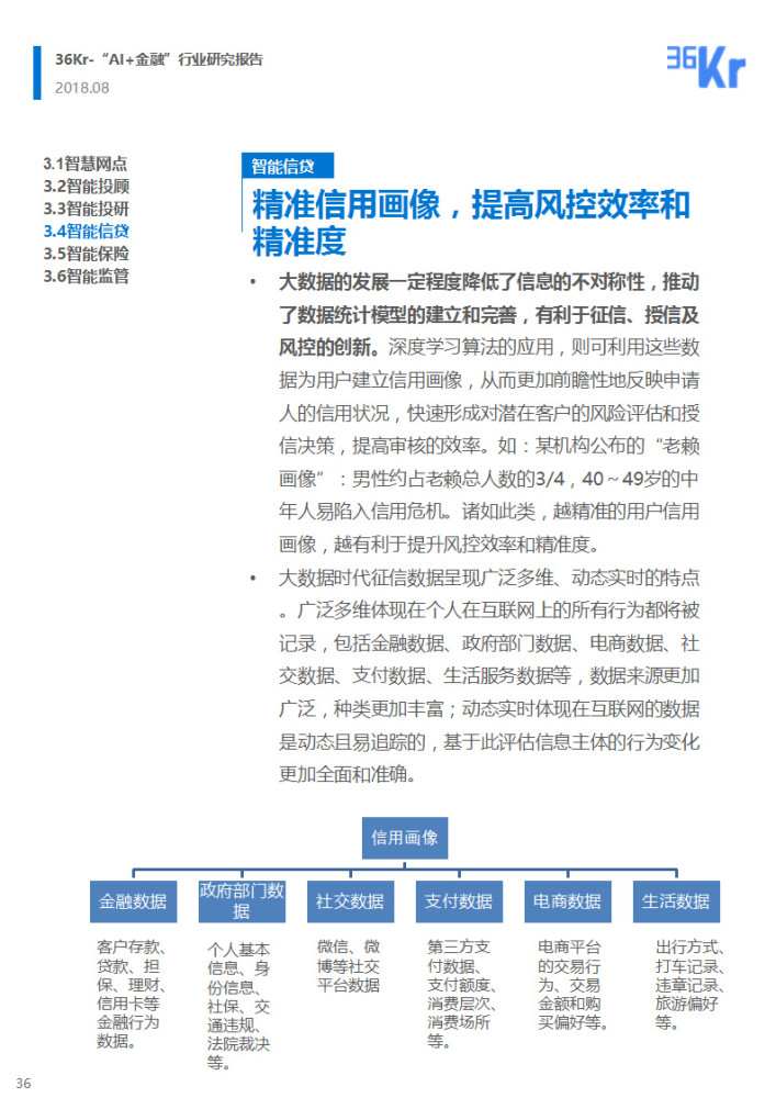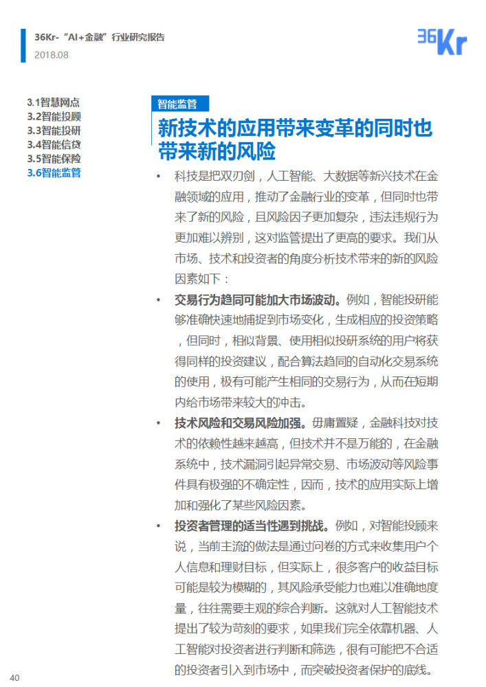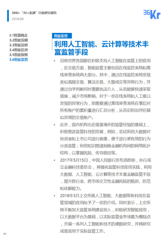 智慧银行、智能投顾、智能投研、智能信贷、智能保险和智能监管是当前人工智能在金融领域的主要应用,分别作用于银行运营、投资理财、信贷、保险和监管等业务场景。智慧银行从提升用户体验和服务效率为主要出发点,实现服务和运营的智能化变革;智能投顾是人工智能在理财领域的应用,旨在利用计算机程序评估用户的风险偏好和理财需求,从而提供自动化的配置建议;智能投研用于辅助投资分析,提升投研效率;信贷领域,基于大数据和深度学习的风控、征信正改变着传统的信贷模式。此外,保险和监管也朝着智能化的方向发展。金融业智能化的变革从各个角度提升了行业效率,为业务模式的创新提供了新思路和新方法,但同时也使金融风险变得更加复杂,新监管手段的探索受到重视。