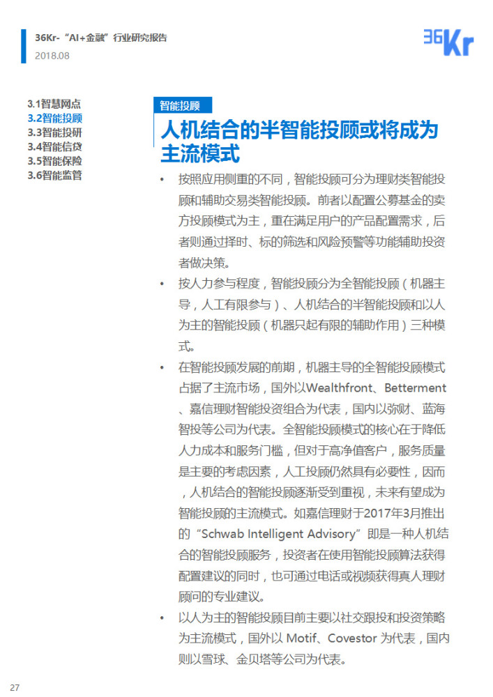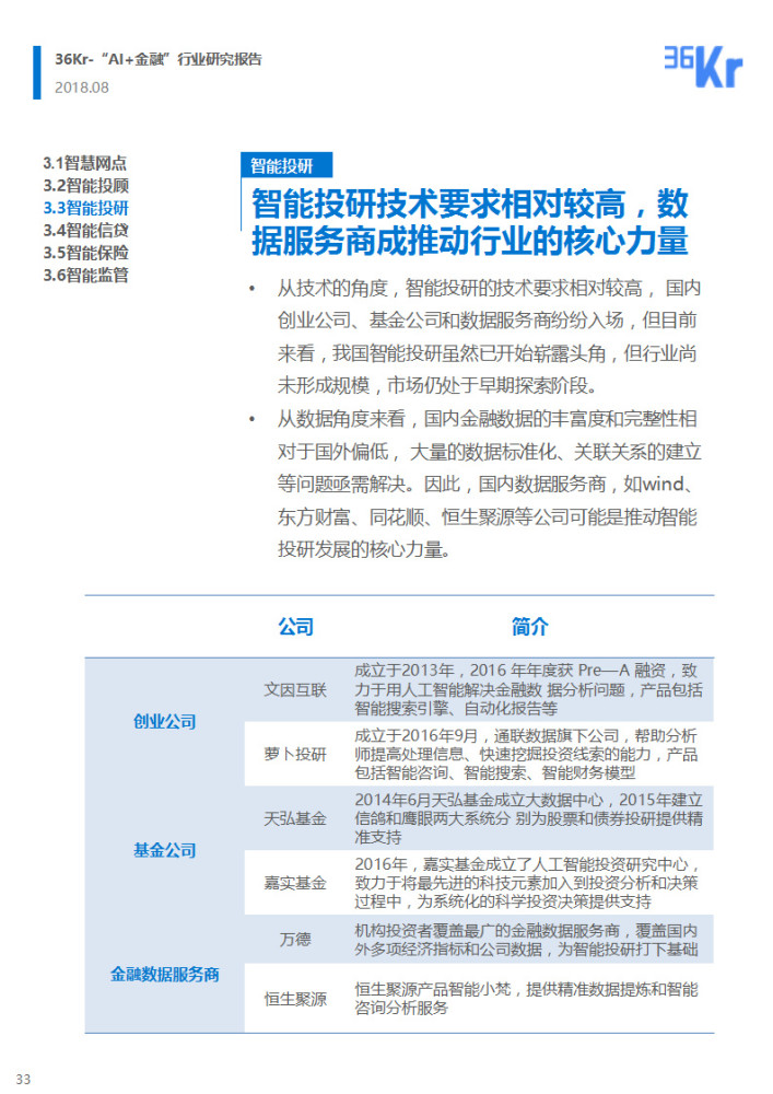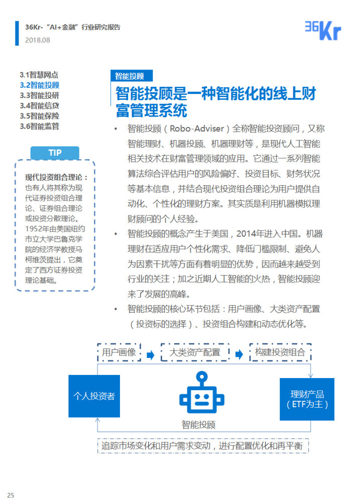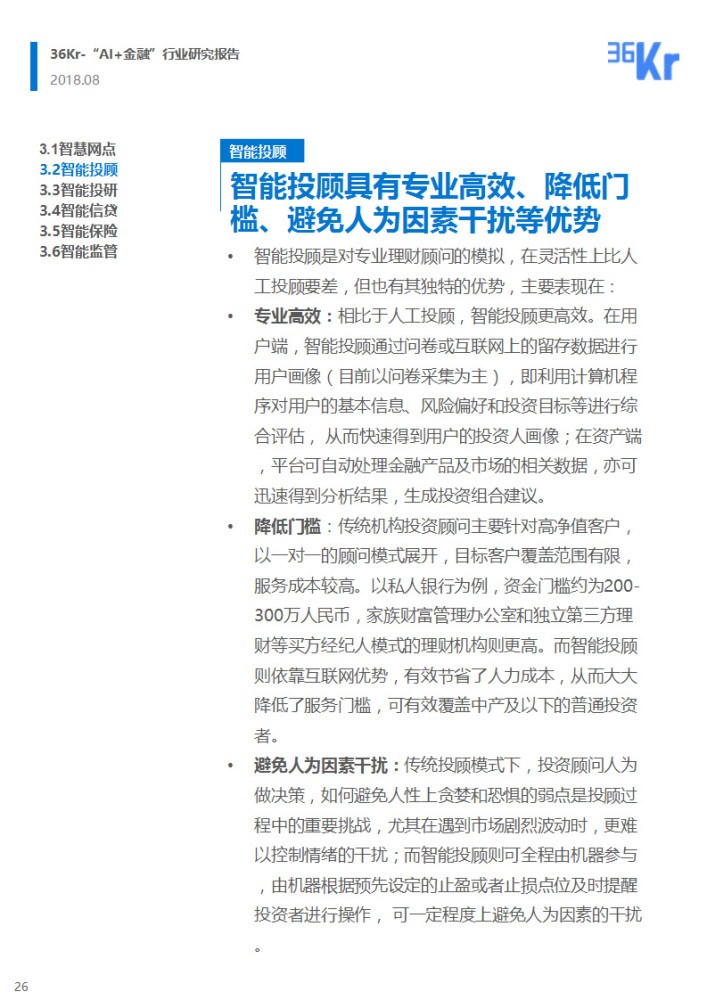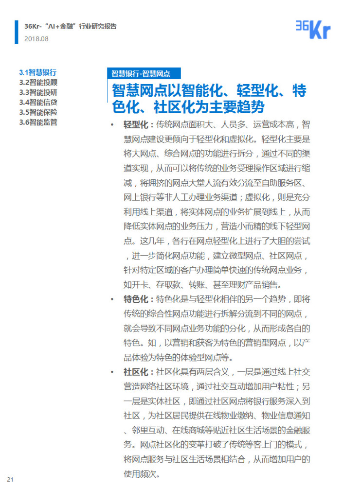 智慧银行、智能投顾、智能投研、智能信贷、智能保险和智能监管是当前人工智能在金融领域的主要应用,分别作用于银行运营、投资理财、信贷、保险和监管等业务场景。智慧银行从提升用户体验和服务效率为主要出发点,实现服务和运营的智能化变革;智能投顾是人工智能在理财领域的应用,旨在利用计算机程序评估用户的风险偏好和理财需求,从而提供自动化的配置建议;智能投研用于辅助投资分析,提升投研效率;信贷领域,基于大数据和深度学习的风控、征信正改变着传统的信贷模式。此外,保险和监管也朝着智能化的方向发展。金融业智能化的变革从各个角度提升了行业效率,为业务模式的创新提供了新思路和新方法,但同时也使金融风险变得更加复杂,新监管手段的探索受到重视。