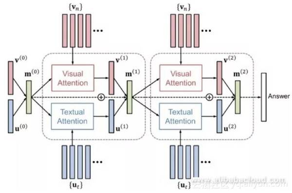 注意使用注意力机制的图像字幕系统可提高视觉问答的性能。注意力机制包括视觉注意(“我在哪里看”)和文本注意力(“我在看哪个词?”)HieCoAtten可以同时或依次创建视觉和文本注意力。DAN在同一空间内投射视觉和文本注意力的结果; 然后它同时产生视觉和文本注意力的下一步。