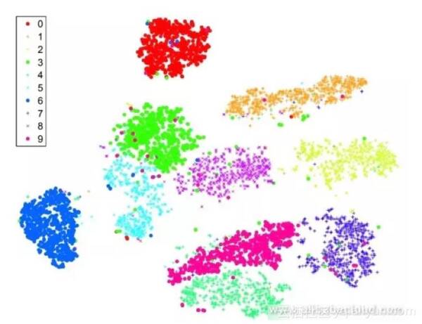 此方法在图像的fc7和pool5特征上使用低维嵌入。例如,将它们缩小到2维并允许它们在2维平面上绘制,具有类似语义信息的图像应该产生与t-SNE类似的结果。该方法与PCA之间的区别在于t-SNE是一种非线性减少方法,可以保留地点之间的距离。我们得到以下图像,该图像是将t-SNE应用于原始MNIST图像的结果。我们可以看到MNIST是一个相对简单的数据集,其中不同分类的图像之间的差异是显而易见的。