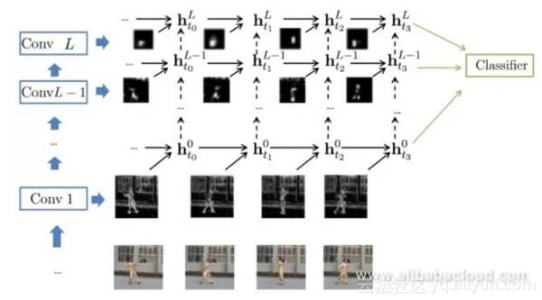 先前的方法仅能够捕获几帧图像之间的依赖关系。此方法使用CNN从单个帧中提取图像特征,然后使用RNN捕获帧之间的依赖关系。