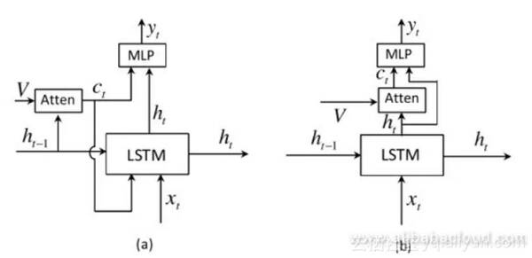 先前的注意力机制将为每个预测的单词产生二维注意图像(图像(a))。但是,对于一些停止词,我们不需要使用图像中的线索。相反,某些单词可以根据上下文生成,完全独立于图像本身。这项工作在LSTM上进行了扩展,并产生了“视觉哨兵”机制,该机制确定是否应根据上下文或图像信息(图像(b))预测当前单词。