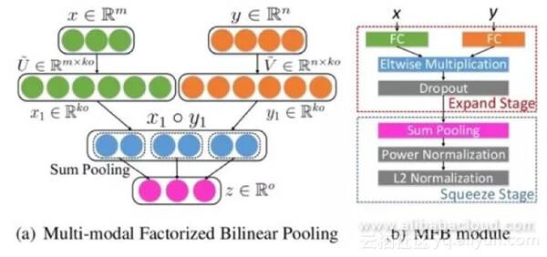该方法使用视觉特征向量和文本特征向量的外积来捕获每个维度上这些状态的特征之间的关系。为了避免明确地计算双线性汇合的高维度结果,我们可以将在细粒度识别中发现的流线型双线性汇合背后的思想应用于视觉问题回答。例如,MFB使用低速率近似背后的概念以及视觉和文本注意机制。