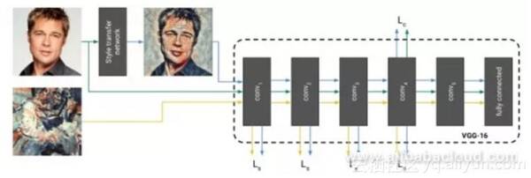 上面直接生成风格迁移的图像的方法的缺点是需要多次迭代才能收敛。解决该问题的方案是训练一个神经网络来直接生成风格迁移的图像。一旦训练结束,进行风格迁移只需前馈网络一次,十分高效。在训练时,将生成图像、原始图像、风格图像三者前馈一固定网络以提取不同层特征用于计算损失函数。