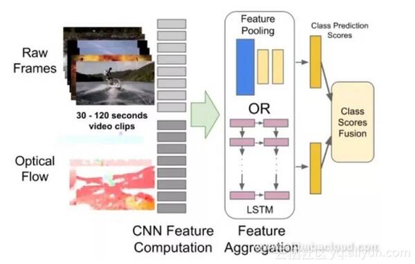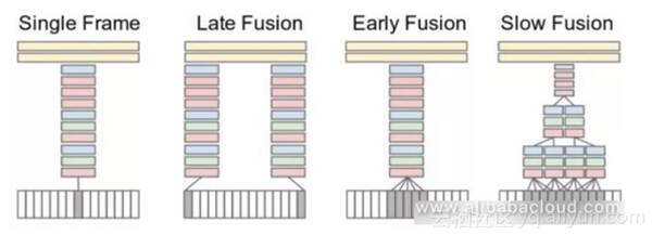 这类方法将视频视为一系列帧图像,网络接收属于视频的一组多帧图像(例如15帧),然后从这些图像中提取深度特征,并最终集成这些图像特征以获得视频的该部分的特征以对其进行分类。实验表明,使用“慢速融合(slow fusion)”效果最佳。此外,独立组织单个帧也可以得到非常有竞争力的结果,这意味着来自单个帧的图像包含大量相关信息。