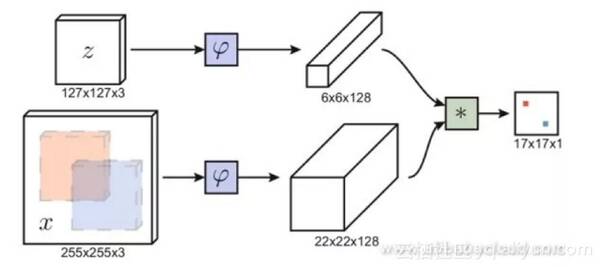 类似于面部验证的概念,利用孪生网络可以在一条线上的目标框内输入图像,并且在另一条线上输入候选图像区域,然后输出两个图像之间的相似度。我们不需要遍历不同帧中的所有其他候选区域;相反,我们可以使用卷积网络,只需要将每个图像前馈一次,通过卷积,我们可以获得二维的响应图,其中最重要的响应位置确定了框的位置。基于孪生网络的方法非常快并且能够处理任何大小的图像。
