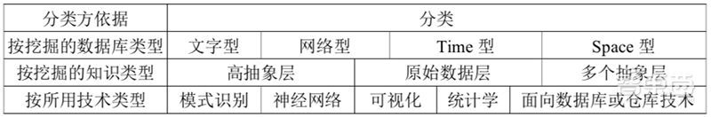 如上图所示,数据挖掘有多种分类方式,可以按照挖掘的数据库类型、挖掘的知识类型、挖掘所用的技术类型进行分类。