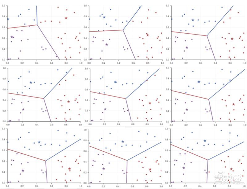 上图是以随机生成的数据点为例,k=3的K-means算法的迭代过程,其中五角星为聚类中心,点的颜色是其类别。在实际应用中,为了获得一个比较好的特征空间,使得“数据之间的相似性与他们在特征空间上的距离有关,距离越近越相似”这句话尽可能成立,我们往往会构建模型来把原数据变换到这么一个特征空间,然后使用K-means算法来进行分类。