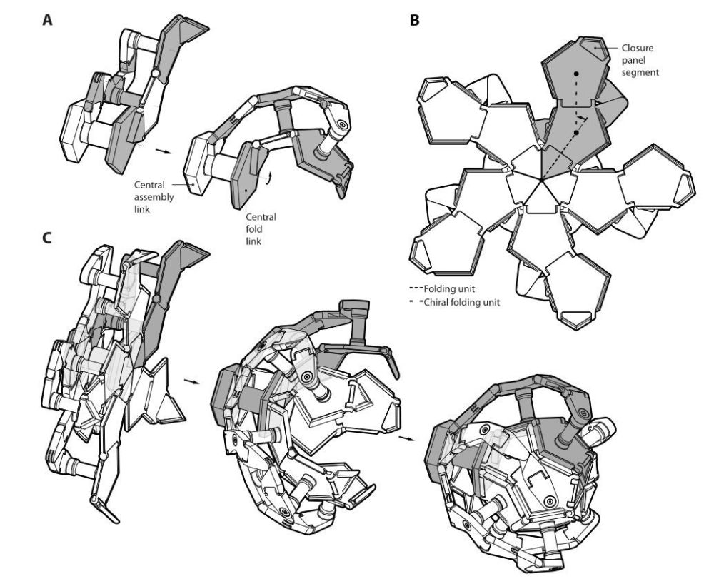 为了实现这个功能,RAD借鉴了折纸,张开时像具有5片花瓣的花朵,5片花瓣完全相同,是通过3D打印的聚合物,材料质地柔软耐用。花瓣们被连接到一系列的旋转接头上,这些旋转这头连载一起形成支架,这样在闭合时又具有一个中空的十二面体结构,能够在观察到猎物的同时迅速关合并且给活体猎物留下足够的空间!