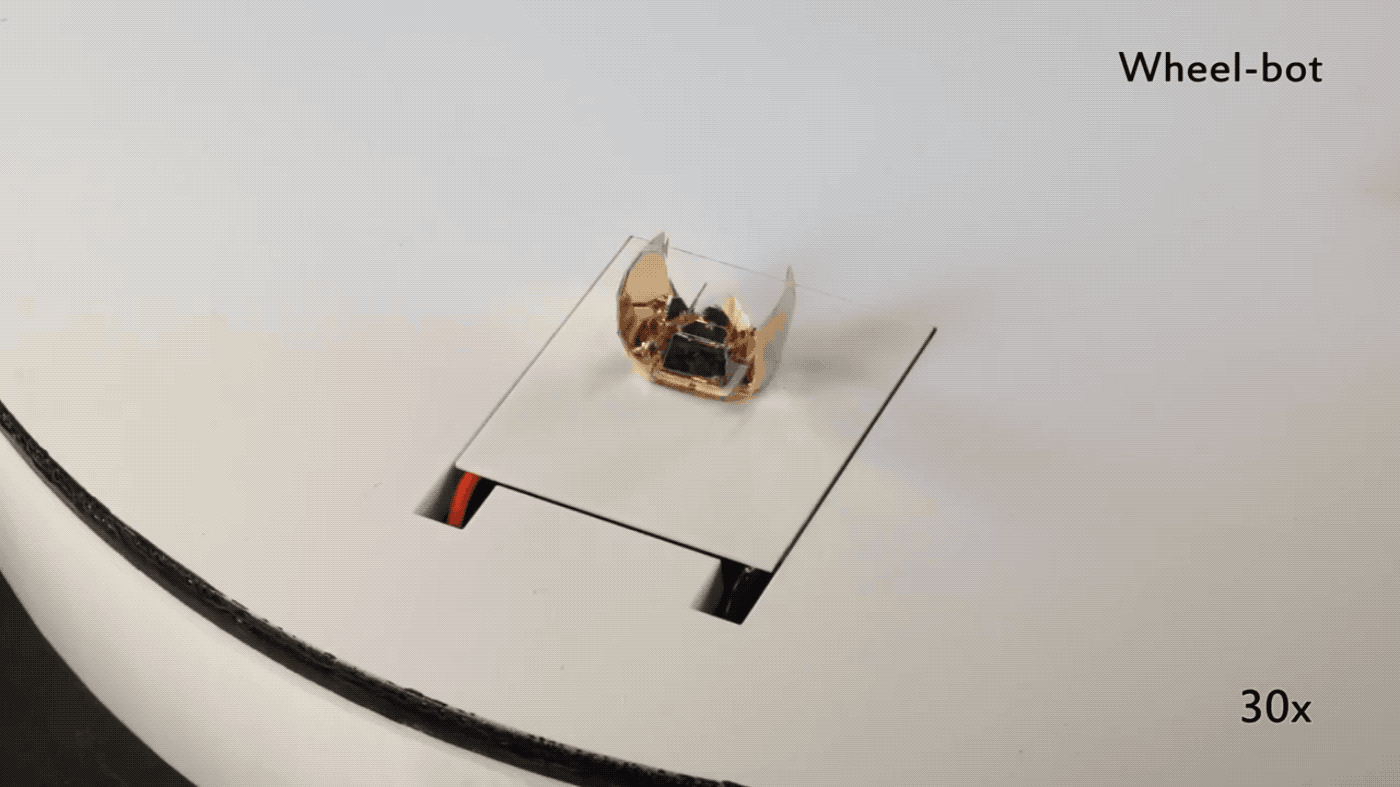 被外骨骼包裹成车轮状的机器人,滚动速度是平时的两倍:
